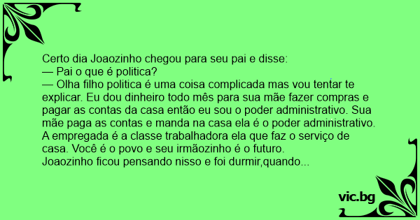 Certa vez Joãozinho pergunta ao pai: — Pai o que é política? E o pai responde: — Política é um conjunto de leis e normas que envolve poder econõmico, governo, classe trabalhadora, o povo e o futuro...