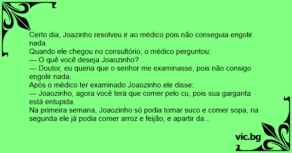— Joaozinho, agora você terá que comer pelo cu, pois sua garganta está entupida.