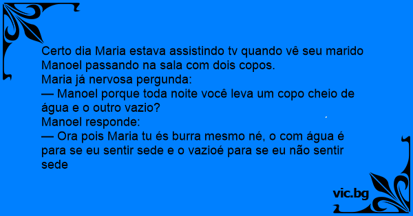 Certo dia Maria estava assistindo tv quando vê seu marido Manoel passando na sala com dois copos.