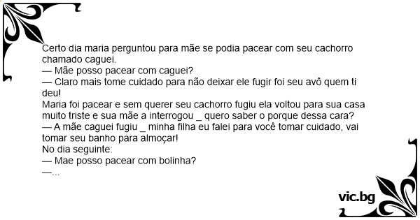 Certo dia maria perguntou para mãe se podia pacear com seu сасhоrrо chamado caguei.