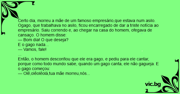 Então, o homem desconfiou que ele era gago, e pediu para ele cantar, porque como todo mundo sabe, quando um gago canta, ele não gagueja. E o gago começou: