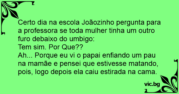 Certo dia na escola Joãozinho pergunta para a professora se toda mulher tinha um outro furo debaixo do umbigo: