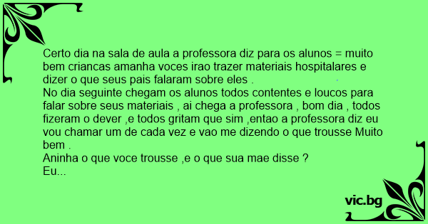 Certo dia na sala de aula a professora diz para os alunos = muito bem criancas amanha voces irao trazer materiais hospitalares e dizer o que seus pais falaram sobre eles .