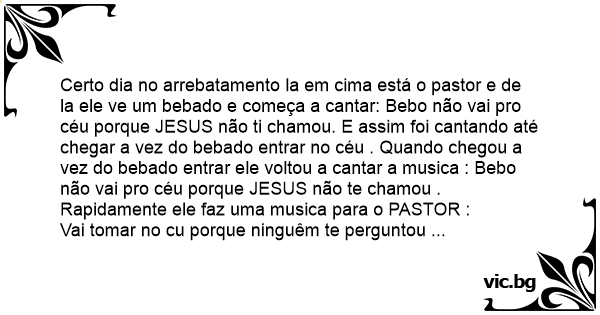 Certo dia no arrebatamento la em cima está o pastor e de la ele ve um bebado e começa a cantar: Bebo não vai pro céu porque JESUS não ti chamou. E assim foi cantando até chegar a vez do bebado entrar no céu . Quando chegou a vez do bebado entrar ele voltou a cantar a musica : Bebo não vai pro céu porque JESUS não te chamou .