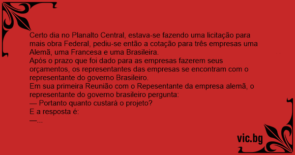 Certo dia no Planalto Central, estava-se fazendo uma licitação para mais obra Federal, pediu-se então a cotação para três empresas uma Alemã, uma Francesa e uma Brasileira.