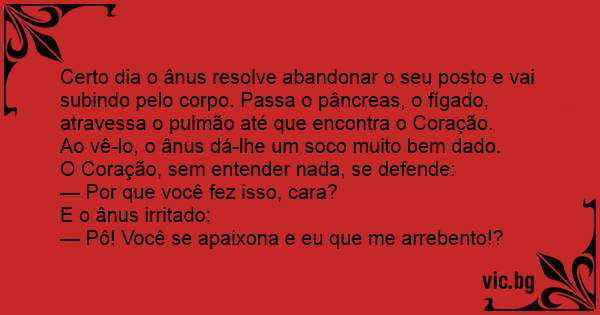 Certo dia o ânus resolve abandonar o seu posto e vai subindo pelo corpo. Passa o pâncreas, o fígado, atravessa o pulmão até que encontra o Coração.