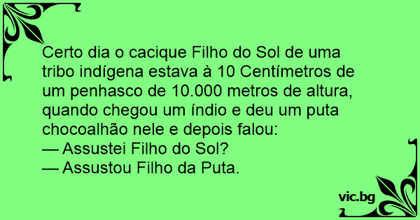 Certo dia o cacique Filho do Sol de uma tribo indígena estava à 10 Centímetros de um penhasco de 10.000 metros de altura, quando chegou um índio e deu um рuта chocoalhão nele e depois falou:
