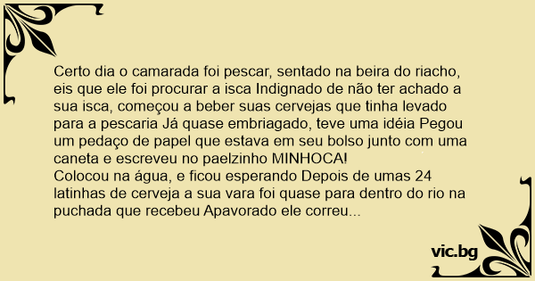 Colocou na água, e ficou esperando Depois de umas 24 latinhas de cerveja a sua vara foi quase para dentro do rio na puchada que recebeu Apavorado ele correu pegar, deu um trabalho danado para tirar, mas ele consigui Quando tirou, tinha um papel escrito: