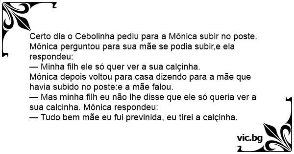 Certo dia o Cebolinha pediu para a Mônica subir no poste. Mônica perguntou para sua mãe se podia subir,e ela respondeu: