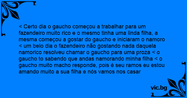 < Certo dia o gaucho começou a trabalhar para um fazendeiro muito rico e o mesmo tinha uma linda filha, a mesma começou a gostar do gaucho e iniciaram o namoro < um belo dia o fazendeiro não gostando nada daquela namorico resolveu chamar o gaucho para uma proza < o gaucho to sabendo que andas namorando minha filha < o gaucho muito macho responde, pois é seu ramos eu estou amando muito a sua filha e nós vamos nos casar