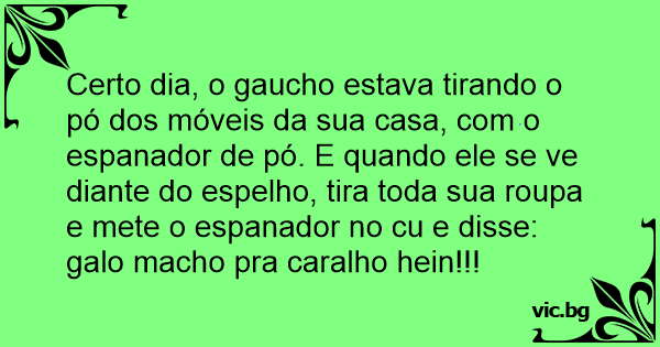 Certo dia, o gaucho estava tirando o pó dos móveis da sua casa, com o espanador de pó. E quando ele se ve diante do espelho, tira toda sua roupa e mete o espanador no cu e disse: galo macho pra саrаlhо hein!!!