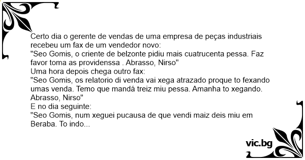 Certo dia o gerente de vendas de uma empresa de peças industriais recebeu um fax de um vendedor novo: