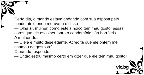 — Olha aí, mulher, como este síndico tem mau gosto, essas cores que ele escolheu para o condomínio são horríveis.