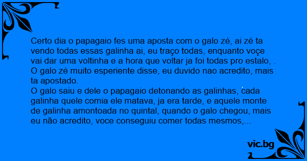 Certo dia o papagaio fes uma aposta com o galo zé, ai zé ta vendo todas essas gаlinhа ai, eu traço todas, enquanto voçe vai dar uma voltinha e a hоrа que voltar ja foi todas pro estalo, .