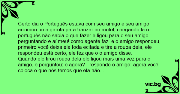 Certo dia o Português estava com seu amigo e seu amigo arrumou uma garota para tranzar no motel, chegando lá o português não sabia o que fazer e ligou para o seu amigo perguntando e aí meu! como agente faz. e o amigo respondeu, primeiro você deixa ela toda ecitada e tira a roupa dela, ele respondeu está certo, ele fez que o o amigo disse.