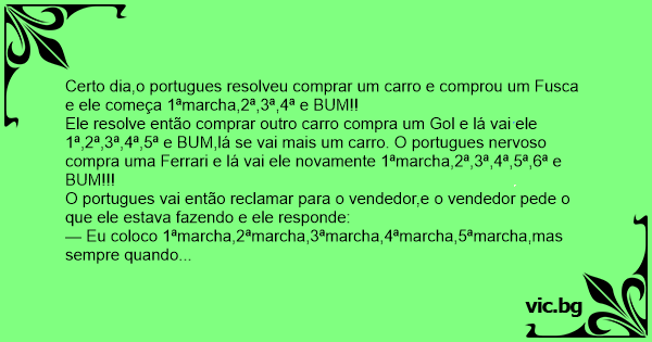 Certo dia,o portugues resolveu comprar um carro e comprou um Fusca e ele começa 1ªmarcha,2ª,3ª,4ª e ВUМ!!