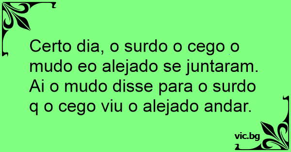 Certo dia, o surdo o cego o mudo eo alejado se juntaram. Ai o mudo disse para o surdo q o cego viu o alejado andar.