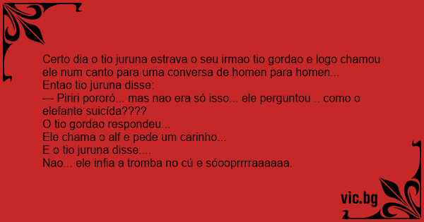 Certo dia o tio juruna estrava o seu irmao tio gordao e logo chamou ele num canto para uma conversa de homen para homen...