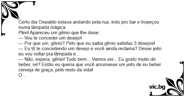 Certo dia Oswaldo estava andando pela rua, indo pro bar e tropeçou numa lâmpada mágica.