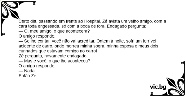 Certo dia, passando em frente ao Hospital, Zé avista um velho amigo, com a cara toda engessada, só com a boca de fora. Endagado pergunta: