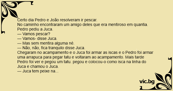 No caminho encontraram um amigo deles que era mentiroso em quantia. Pedro pediu a Juca.