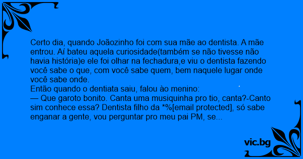 Certo dia, quando Joãozinho foi com sua mãe ao dentista. A mãe entrou. Aí bateu aquela curiosidade(também se não tivesse não havia história)e ele foi olhar na fechadura,e viu o dentista fazendo você sabe o que, com você sabe quem, bem naquele lugar onde você sabe onde.