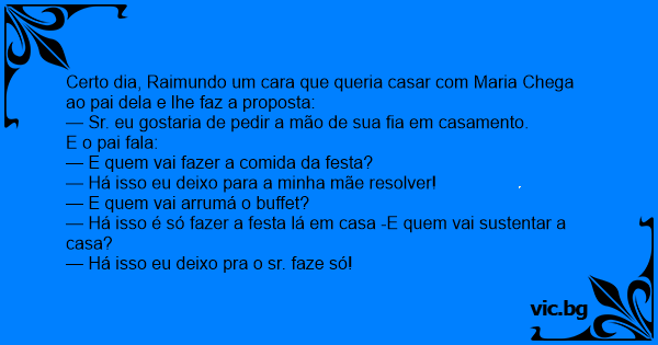 Certo dia, Raimundo um cara que queria casar com Maria Chega ao pai dela e lhe faz a proposta: