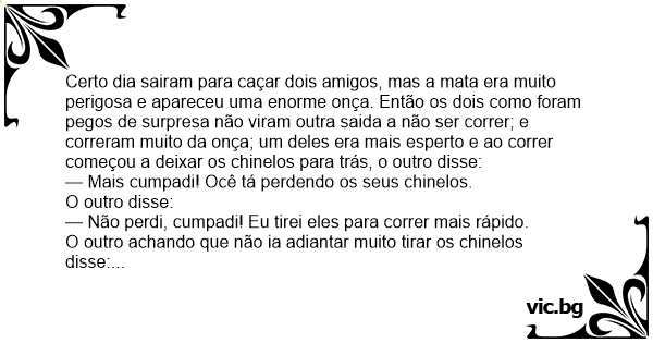 Certo dia sairam para caçar dois amigos, mas a mata era muito perigosa e apareceu uma enorme onça. Então os dois como foram pegos de surpresa não viram outra saida a não ser correr; e correram muito da onça; um deles era mais esperto e ao correr começou a deixar os chinelos para trás, o outro disse: