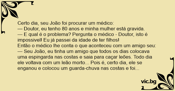 — E qual é o problema? Pergunta o médico - Doutor, isto é impossivel! Eu já passei da idade de ter filhos!