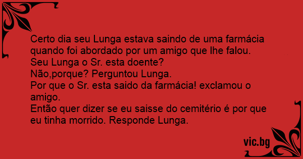 Certo dia seu Lunga estava saindo de uma farmácia quando foi abordado por um amigo que lhe falou.