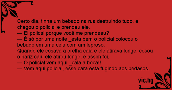 Certo dia, tinha um bebado na rua destruindo tudo, e chegou o policial e prendeu ele.