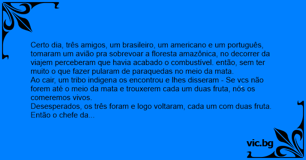 Certo dia, três amigos, um brasileiro, um americano e um português, tomaram um avião pra sobrevoar a floresta amazônica, no decorrer da viajem perceberam que havia acabado o combustível. então, sem ter muito o que fazer pularam de paraquedas no meio da mata.
