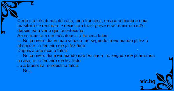 Certo dia três donas de casa, uma francesa, uma americana e uma brasileira se reuniram e decidiram fazer greve e se reunir um mês depois para ver o que aconteceria.