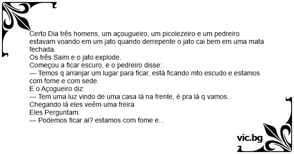 Certo Dia três homens, um açougueiro, um picolezeiro e um pedreiro estavam voando em um jato quando derrepente o jato cai bem em uma mata fechada.