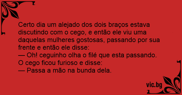 Certo dia um alejado dos dois braços estava discutindo com o cego, e então ele viu uma daquelas mulheres gostosas, passando por sua frente e então ele disse: