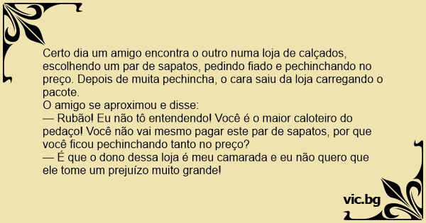 Certo dia um amigo encontra o outro numa loja de calçados, escolhendo um par de sapatos, pedindo fiado e pechinchando no preço. Depois de muita pechincha, o cara saiu da loja carregando o pacote.