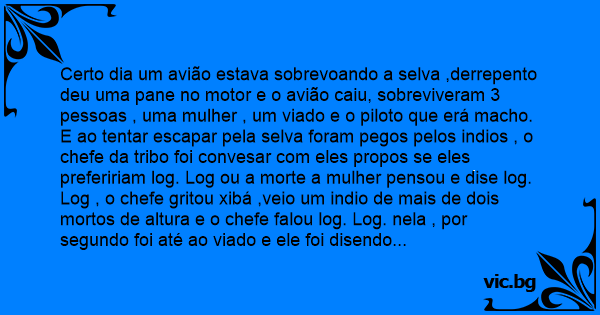 Certo dia um avião estava sobrevoando a selva ,derrepento deu uma pane no motor e o avião caiu, sobreviveram 3 pessoas , uma mulher , um viаdо e o piloto que erá macho.