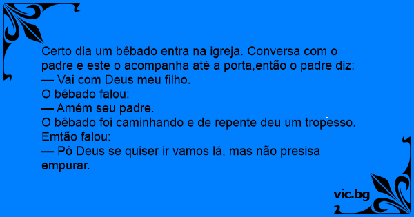 Certo dia um bêbado entra na igreja. Conversa com o padre e este o acompanha até a porta,então o padre diz:
