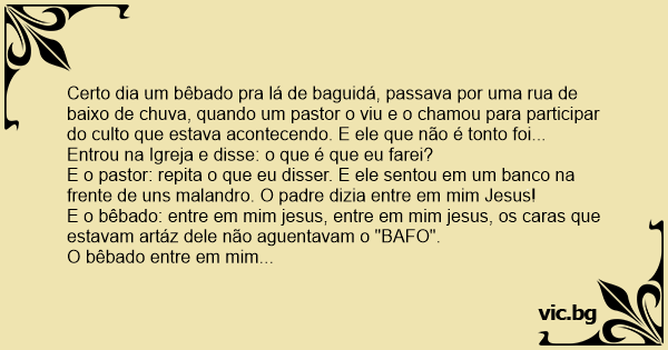 Certo dia um bêbado pra lá de baguidá, passava por uma rua de baixo de chuva, quando um pastor o viu e o chamou para participar do culto que estava acontecendo. E ele que não é тоnто foi...