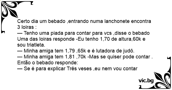 — Tenho uma piada para contar para vcs ,disse o bebado Uma das loiras responde -Eu tenho 1,70 de altura,60k e sou triatleta.