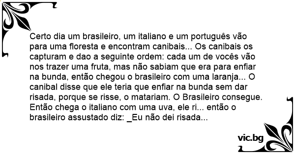 Certo dia um brasileiro, um italiano e um português vão para uma floresta e encontram canibais... Os canibais os capturam e dao a seguinte ordem: cada um de vocês vão nos trazer uma fruta, mas não sabiam que era para enfiar na bunda, então chegou o brasileiro com uma laranja... O canibal disse que ele teria que enfiar na bunda sem dar risada, porque se risse, o matariam. O Brasileiro consegue.