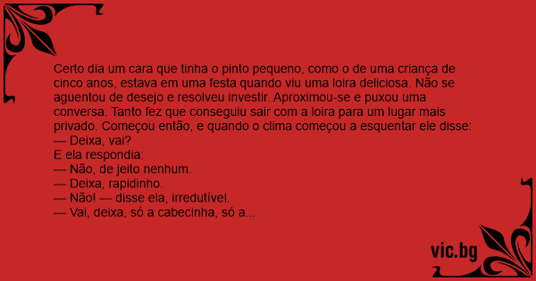 Certo dia um cara que tinha o pinto pequeno, como o de uma criança de cinco anos, estava em uma festa quando viu uma loira deliciosa. Não se aguentou de desejo e resolveu investir. Aproximou-se e puxou uma conversa. Tanto fez que conseguiu sair com a loira para um lugar mais privado. Começou então, e quando o clima começou a esquentar ele disse: