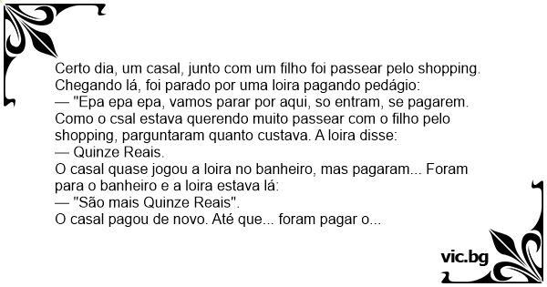 Certo dia, um casal, junto com um filho foi passear pelo shopping. Chegando lá, foi parado por uma loira pagando pedágio: