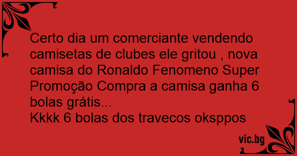 Certo dia um comerciante vendendo camisetas de clubes ele gritou , nova camisa do Ronaldo Fenomeno Super Promoção Compra a camisa ganha 6 bolas grátis...