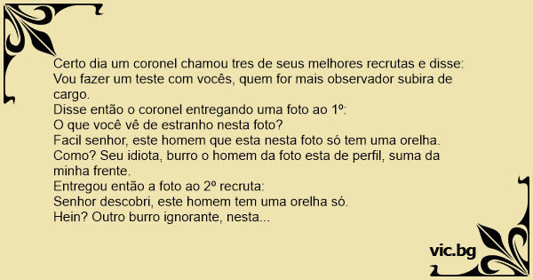 Certo dia um coronel chamou tres de seus melhores recrutas e disse: