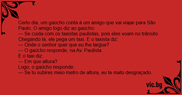 Certo dia, um gaúcho conta á um amigo que vai viajar para São Paulo. O amigo logo diz ao gaúcho: