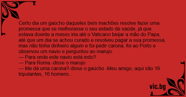Certo dia um gaúcho daqueles bem machões resolve fazer uma promessa que se melhorasse o seu estado de saúde, já que estava doente a meses iria até o Vaticano beijar a mão do Papa, até que um dia se achou curado e resolveu pagar a sua promessa, mas não tinha dinheiro algum e foi pedir carona, foi ao Porto e observou um navio e perguntou ao marujo: