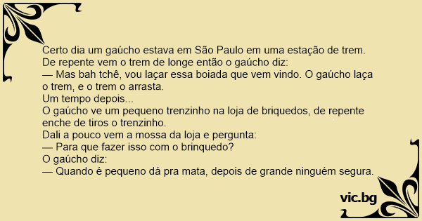 Certo dia um gaúcho estava em São Paulo em uma estação de trem. De repente vem o trem de longe então o gaúcho diz: