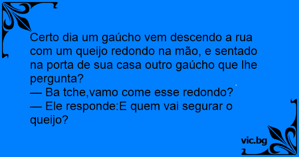 Certo dia um gaúcho vem descendo a rua com um queijo redondo na mão, e sentado na porta de sua casa outro gaúcho que lhe pergunta?