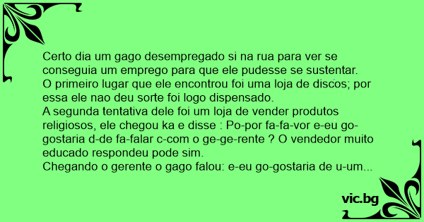 Chegando o gerente o gago falou: e-eu go-gostaria de u-um e-empre-pregocomo ven-vendedor d-de bi-biblias; o gerente logo falou como vc quer vender biblias se vc é gago ? O gago falou: Po-por fa-favor m-me dê u-uma cha-chance e-eu te-tenho me-meus tru-truques; de tanto insistir o gerente deu uma chance pra ele. Dai o gerente deu-lhe uma cesta cheia de biblias e deu para ele sair na rua vendendo. No final da tarde ele chegou com a cesta vazia; e o gerente falou Nossssa !!! vc levou 100 biblias e vendeu todas ? po-pois é e-eu te-te fa-falei q-que e-eu ti-ttinha me-meus tru-truques. No outro dia o gerente lhe deu 200 biblias, e aconteceu a mesma coisa, passado um mes ele ficou sendo o melhor vendedor da loja, até que um dia o gerente lhe perguntou por favor gago me fale esse seu truque a empresa precisa saber !!! O gago lhe respondeu; t-tá bo-bom e-eu t-te fa-falo: e-eu fa-falo as-assim pa-para o cli-cliente:mo-moço vo-voce q-quer com-comprar bi-biblia ? Se e-ele fa-fala que s-sim e-eu vend-vendo s-se e-ele fa-falar q-que na-nao e-eu f-falo pa-para e-ele q-que s-se e-ele na-nao com-comprar e-eu le-leio a bi-biblia to-to-dinha pa-para e-ele.